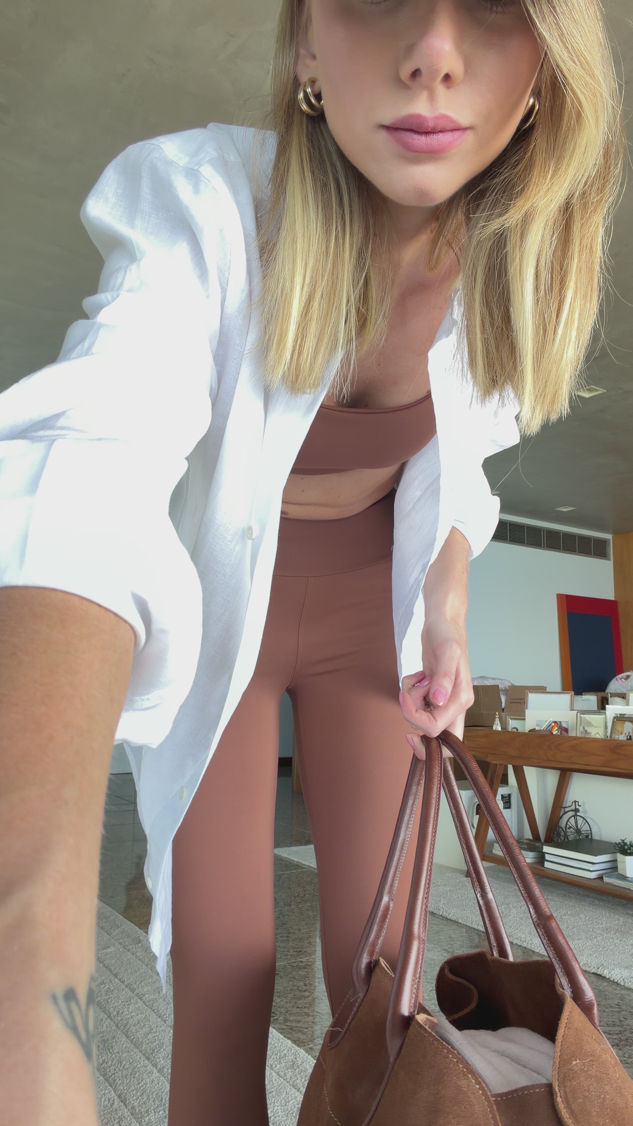 O top da Linha Gaia na cor "avelã" é confeccionado em Tecido UP Soft CO₂, uma malha de poliamida biodegradável com elastano que oferece toque macio, compressão suave e zero transparência, unindo conforto, elegância e sustentabilidade em cada detalhe. Com alta elasticidade, respirabilidade e secagem rápida, as peças proporcionam liberdade de movimento e bem-estar absoluto, adaptando-se perfeitamente ao corpo. O tecido conta com a tecnologia CO₂ Control®, desenvolvida para acelerar o processo de decomposição após o descarte em aterros sanitários, contribuindo para a redução do impacto ambiental. Além disso, possui proteção UV 50+ e certificação Oeko-Tex® Standard 100 – Classe I, que garante ser livre de substâncias nocivas à pele humana.